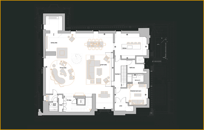 Lift/Stair Lobby with Coats Wardrobe. Reception Areas with sitting areas, Dining Area and Bar. External Balcony. Guest Cloakroom. Stairs leading to Mezzanine & Rooftop Garden. Kitchen with island seating. Entertainment Suite (or Bedroom 6 Suite).