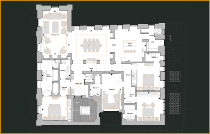 Master Suite with Lobby, Bedroom, Dressing Room & Bathroom.